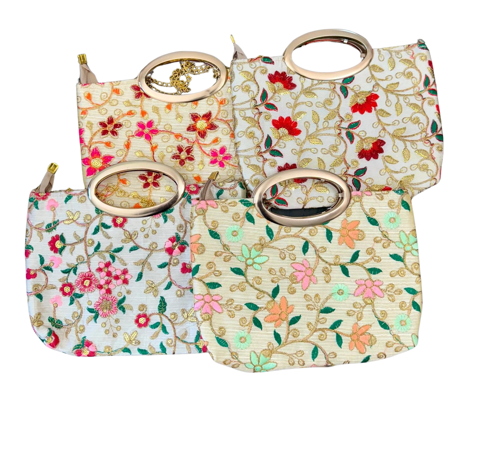 Crafted with traditional Indian artistry, our handbags and purses feature exquisite thread work and golden flower designs. Ideal for Pooja return gifts or as a thoughtful present for any occassion.