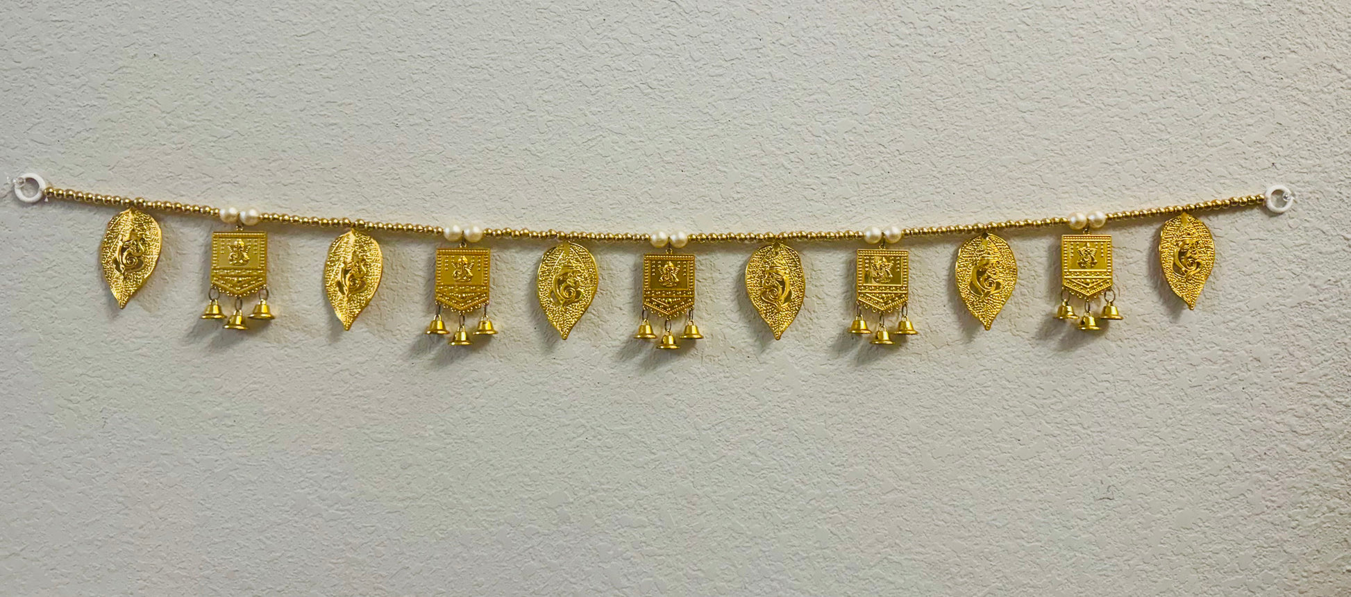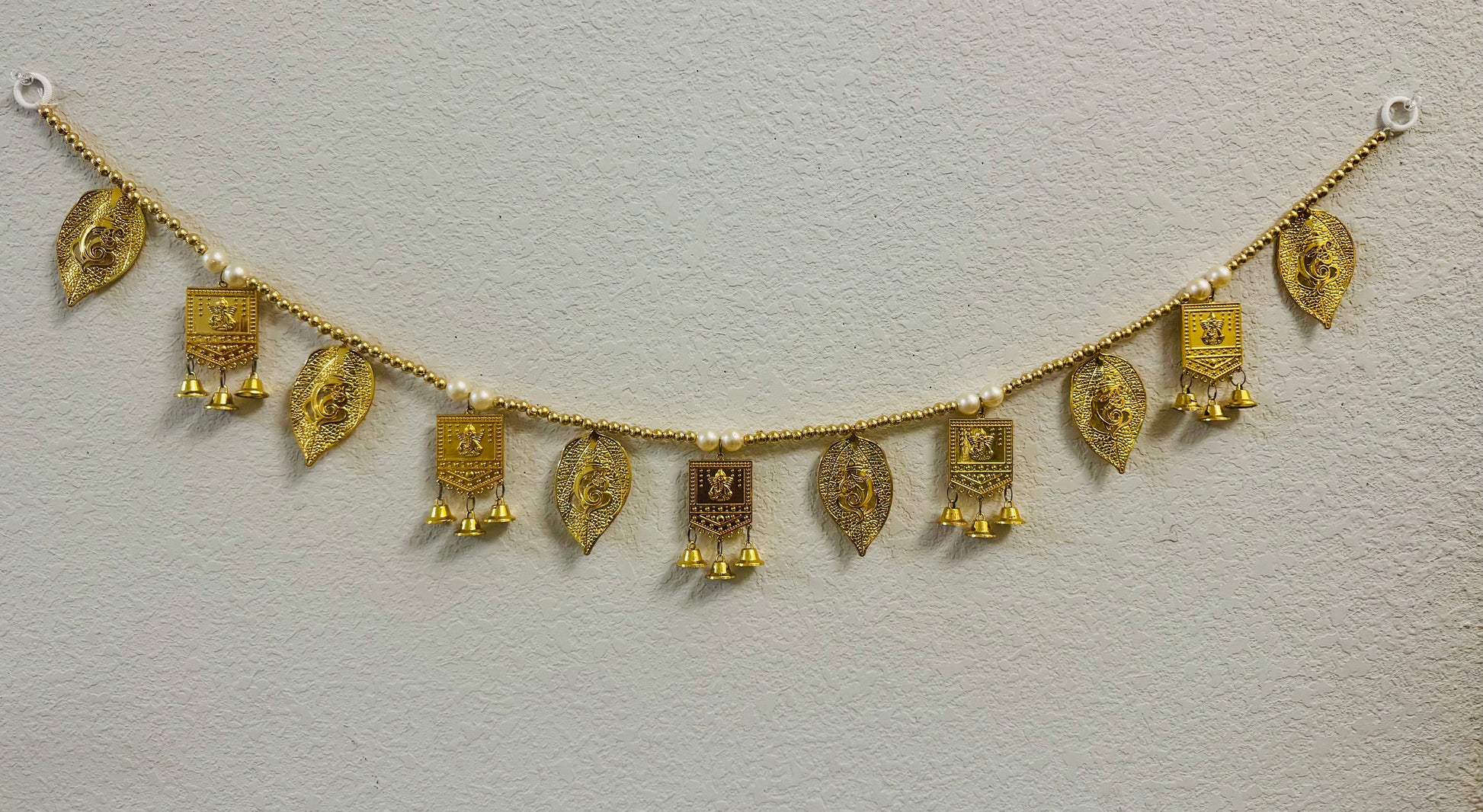 Acrylic golden leaf thoran with ganesha idol and golden beads.